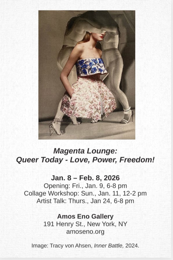◈I’ll be showing Inner Battle in Queer Today Love Power Freedom with the Magenta Lounge group at Amos Eno Gallery. The exhibition takes place below street level, down a steep set of stairs, in one of the Lower East Side’s iconic underground spaces. It’s the kind of room that has always existed for artists and community, quietly holding history.